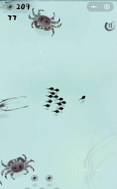蝌蚪变青蛙在这里大家要做的就是养成蝌蚪,并且躲避螃蟹以及下的追捕过程中,你可以看到这个画风,就像水墨画一样,从一开始带着蝌蚪到处去寻找红点食物。在荷花池以及睡莲池中不停地摇大,而且还以不同季节场景分类了关卡。