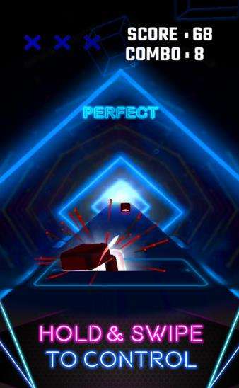方块节奏3D就像是在玩AR游戏一样的,玩家们自己跟着任务关卡的音乐节奏来完成每一个关卡的节奏方块切割。分数会累计在上方显示给你,方块上面会有箭头显示向上滑动还是向左向右向下。简单的挑战的方块颜色只有一种,大家根据你的游戏经验成熟度选择不同的音乐,之后的歌曲会在你提升等级的时候解锁。每一个都是一样的三颗星星开始收集,这里会提供三次漏点的机会。