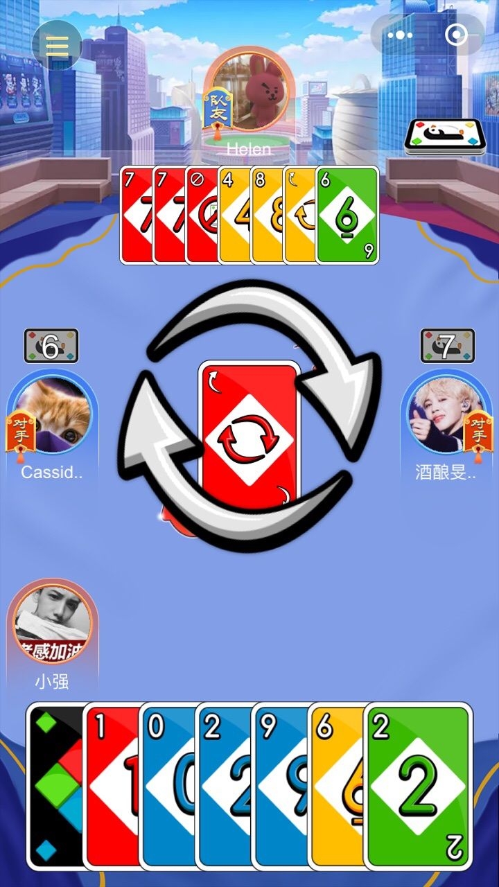 1、玩法还是比较简单的,顺序是可以利用反转牌来改变方向,开局的时候是随机发牌什么颜色的牌都可以。