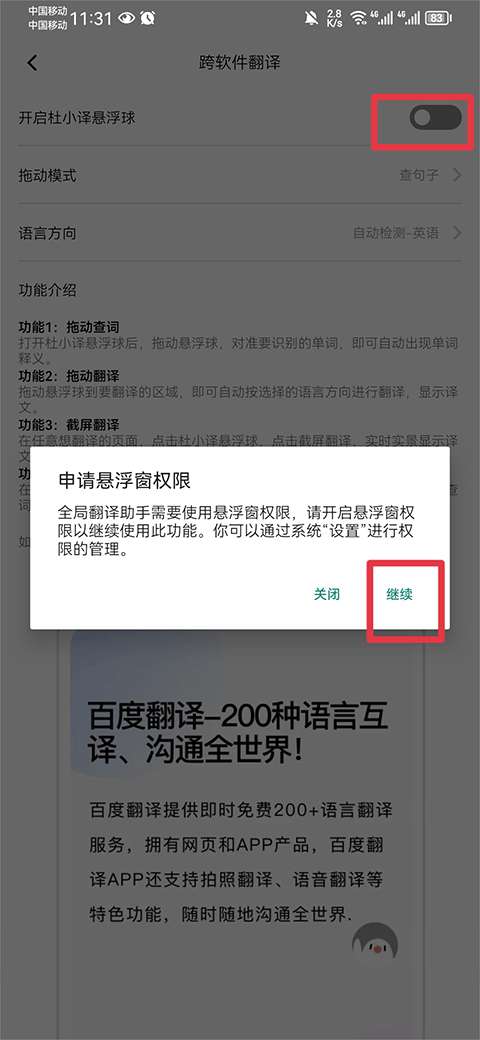 3、进入后点击开启杜小译悬浮球后会弹出申请悬浮窗权限,点击继续。