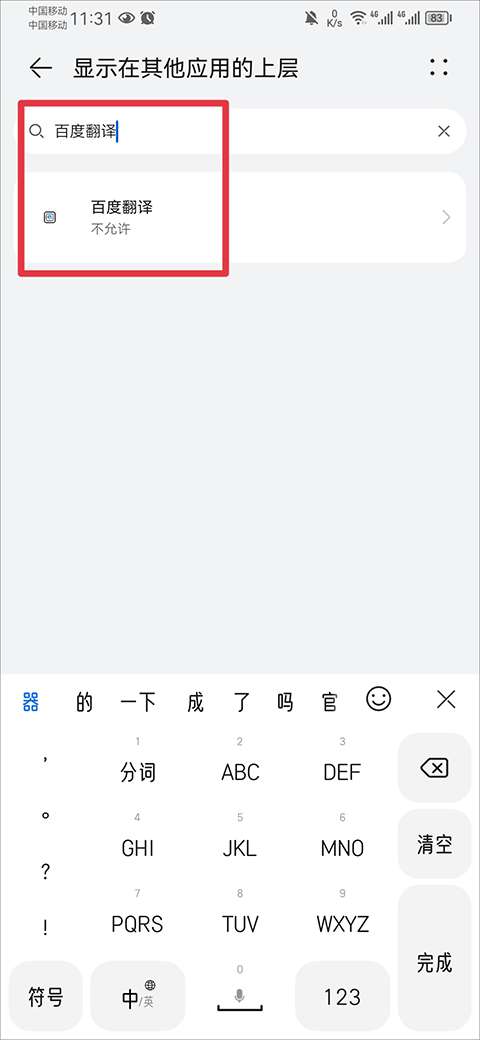 4、跳转至手机设置中,在搜索框中输入百度翻译并点击。