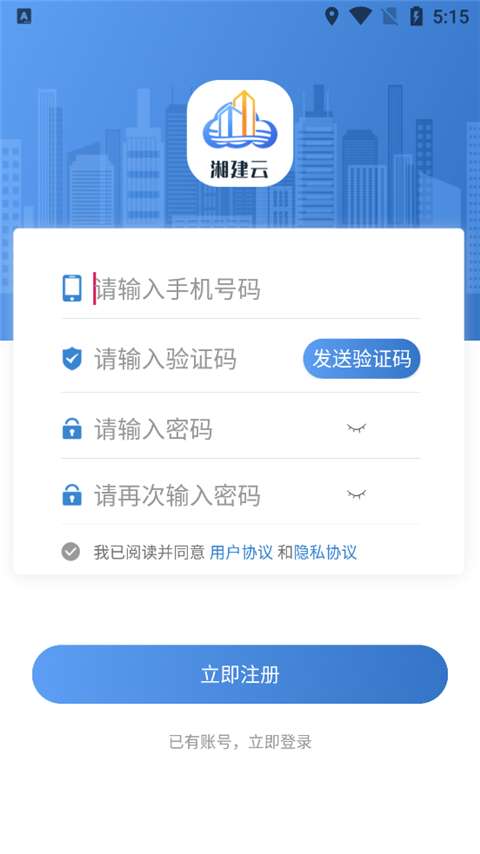 1、进入应用的注册页面,输入手机号、验证码和密码,点击立即注册。