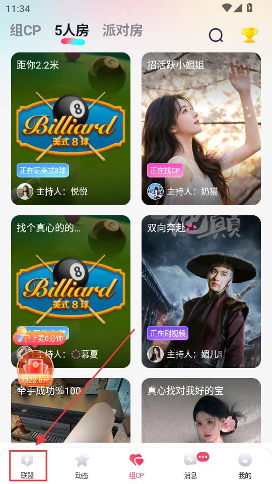 1、打开软件后需要登录,进入主界面,点击左下角联盟。