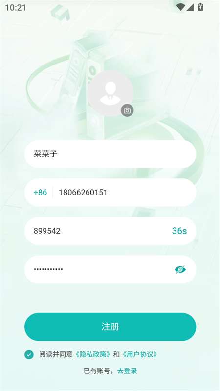2、输入昵称、电话号码、验证码、密码进行注册操作。