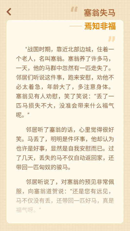 3、对于谜语的每一个内容,都会提供相应的有趣的故事供你阅读,帮助你更好地理解谜语。