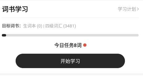 1、首先,打开一点英语app并进入软件。然后,单击底部菜单栏中的“学习”选项进入学习部分。在学习计划中,查看您当前正在学习的词汇阶段,然后单击右侧的箭头。