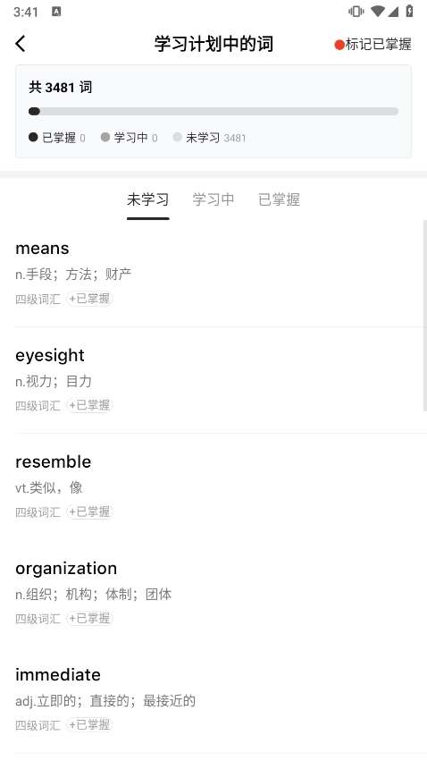 3.在学习计划中输入单词,切换到掌握栏,你就可以找到学到的单词了。
