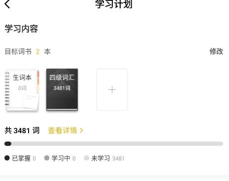 2、转到学习计划页面,在目标词汇书下找到查看详细信息的选项。