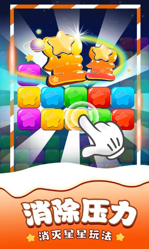 1、点击消除,通过观察点击相同颜色的星星就可以便可以消除,获得积分,累积到通关需要的分数就成功通关。