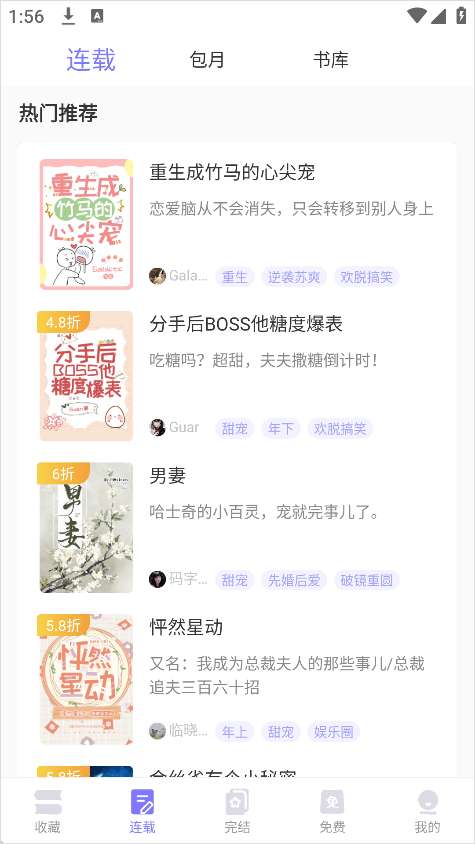 1、打开寒武纪年小说应用程序后,您可以在主页上看到五个主要部分:“收藏夹”、“续集”、“完成”、“免费”和“我的”,功能布局清晰简洁。