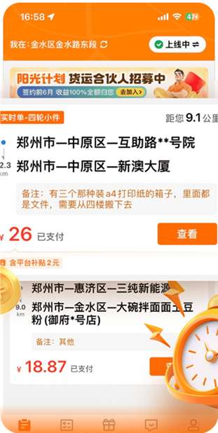 3、之后,主人可以在各自的城市位置正式开始抓取和接受订单,并从事货物运输。