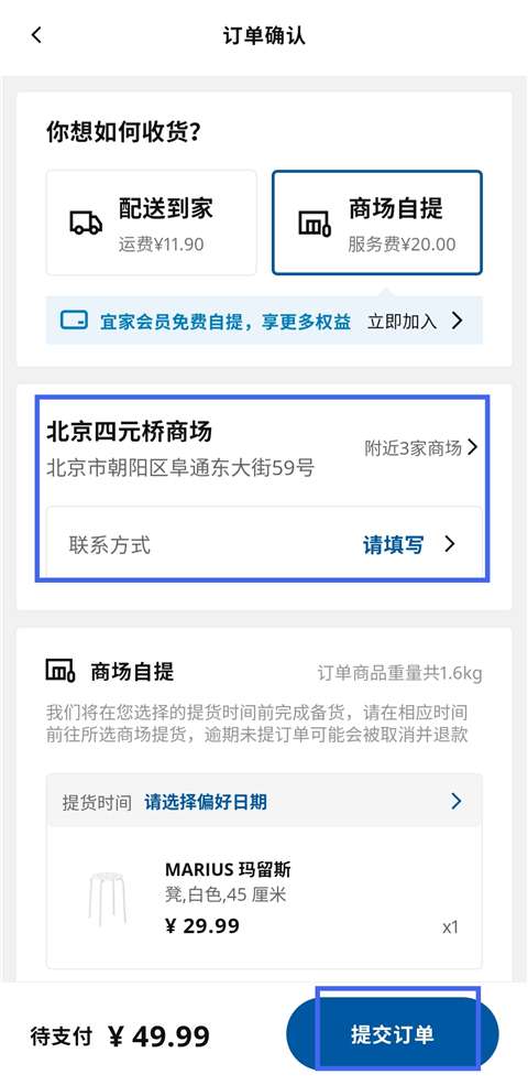 若选择商场自提方式,选择自提商场,填写联系方式,点击【提交订单】即可。