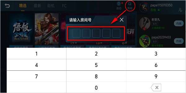 5、也可以点击上面的放大镜按钮,搜索房间号,进入好友创建的房间。