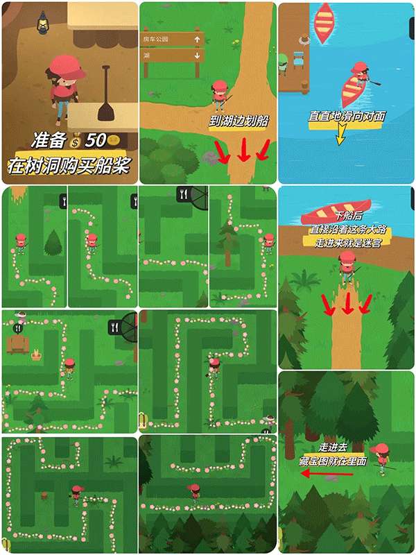 6、走迷宫:50去湖边划船去对面走迷宫,在迷宫的尽头。