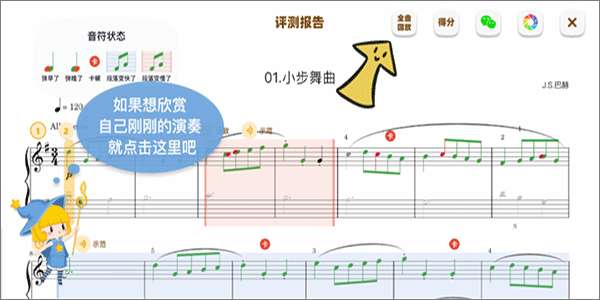 4、熟悉谱子后您还可以使用自由模式弹奏,完成后就能看到AI智能评测报告了,针对你的练习还会给出建议;