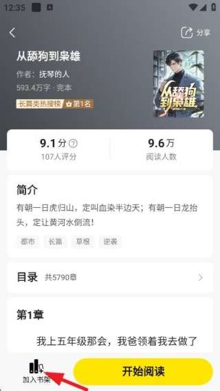 4、点击进入小说页面,可以看到书架功能,只需直接添加即可。