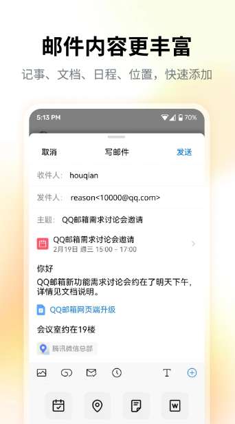 QQ邮箱全面支持邮件通用协议,协助在手机上管理你的所有邮箱。是一款功能强大的邮件管理工具,旨在为用户提供便捷高效的邮件收发体验。无论是个人用户还是企业用户,QQ邮箱都能满足其多样化的邮件管理需求。通过QQ邮箱APP,用户可以随时随地查看、收发邮件,轻松管理多个邮箱账号,快速分类、搜索、存档邮件。同时,APP还支持邮件的加密收发,保证用户信息安全。感兴趣的朋友不要错过下载。