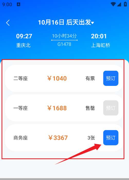 6、然后根据自己的需要选择座位等级,然后点击右侧的【预订】按钮进行后续的订票服务。