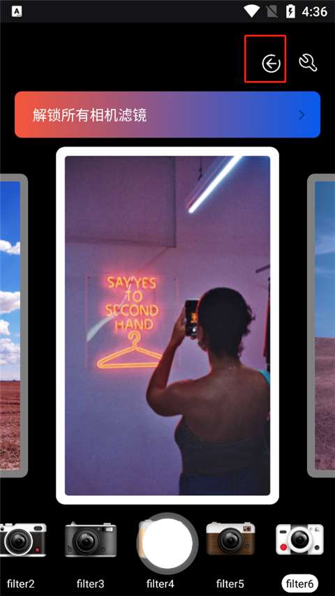 1、打开软件进入,为用户提供了海量的胶卷滤镜,你只需选择自己喜欢的滤镜,点击中间的拍照键即可。
