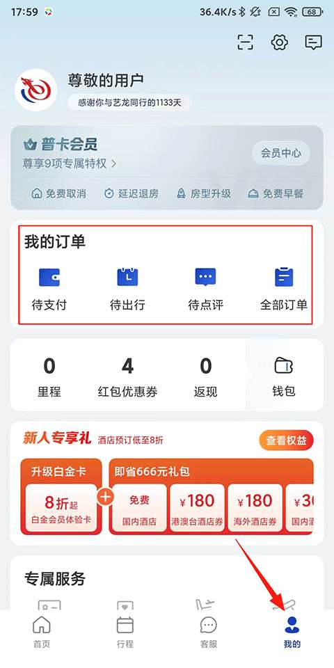 1、打开艺龙旅行应用程序,点击“我的订单”。