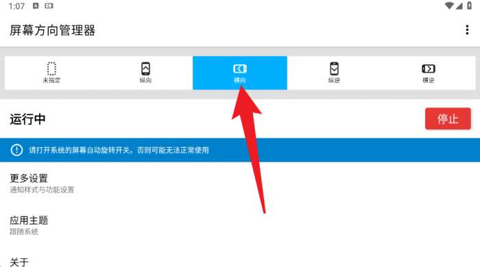 3、运行中可选择【横向】、【纵向】等模式,自由控制屏幕方向。
