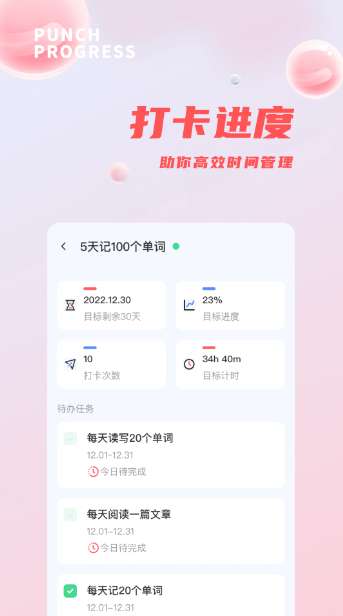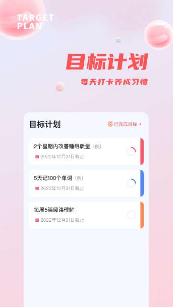 1、【目标计划】制定宏观目标,设置目标实现的小任务,丰富的目标进度展示样式,量化目标进度,每天坚持目标打卡,告别拖延症。