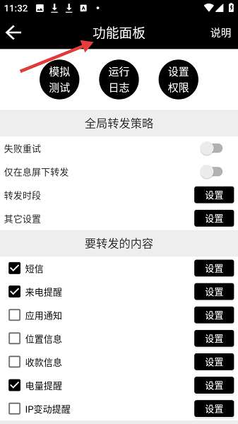 1、功能面板页有模拟测试、运行日志等功能按钮,可设置全局转发策略,选择短信、来电提醒等转发内容。