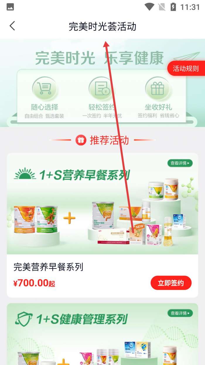 2、进入完美时光荟活动页,呈现完美时光,乐享健康主题,有营养早餐等推荐活动,可按需签约选购。