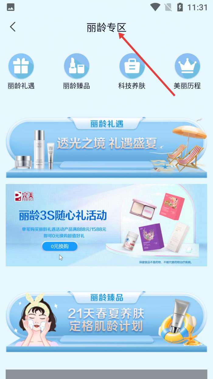 3、丽龄专区页面,含丽龄礼遇、臻品等板块,有透光之境活动、3S随心礼等,可参与0元换购享福利。