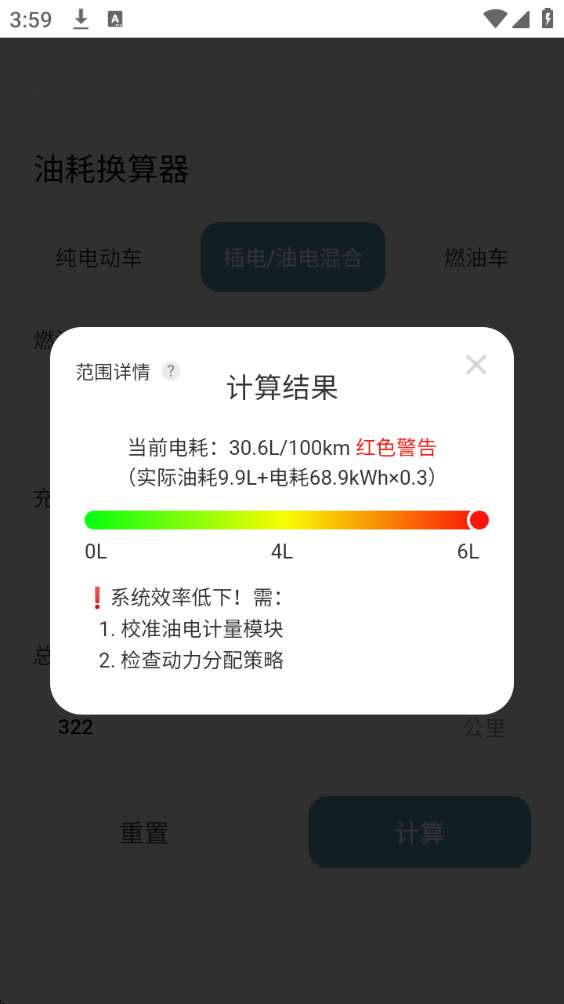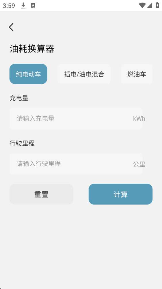4、然后就可选择计算方式,输入充电、加油量和行驶流程,点击“计算”按钮来进行下一步。