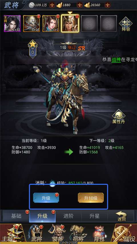 2、点击武将,为各武将升级进阶。