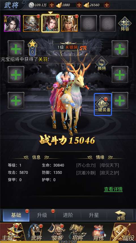 4、一键装备即可为武将配置装备。