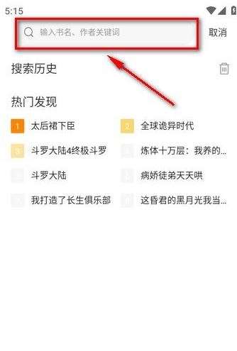 1、点击头部的搜索框,输入书名、作者关键词,就可以搜索。