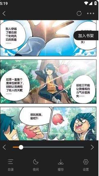 4、下图就是看漫画的界面,上下滑动操作;点击一下,还可以选择目录、夜间、缓存和设置。