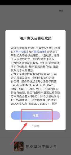 1、启动应用程序后,查看用户协议和隐私政策内容,确认后点击同意进入壁纸界面。