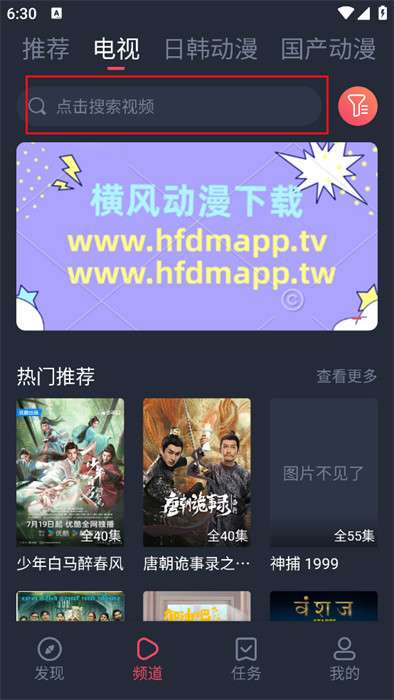 1、打开横风动漫APP后,在首页顶部可以看到一个醒目的搜索栏,轻触即可开始搜索,界面布局如下图所示: