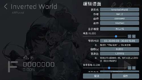 点击铅笔图标,屏幕右边出现谱面设置界面,这里可以调节谱面定数,宽高比和Tip等,请自行调节(记得保存)。