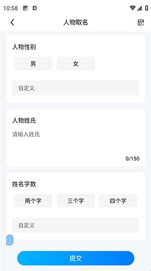 点击人物取名,选择人物性别,输入姓氏、姓名字数等信息即可快速生成。