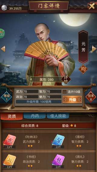 技能升级: 提升门客的技能等级,增强其在政务处理、战斗等方面的能力。