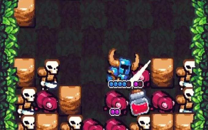 铲子骑士口袋地牢在这里是一个地下的地牢,有很多的药品以及怪物等着你去攻击,通过左右移动的方式来在迷宫般的场景里面一动,然后先从药品开始收集起,看到旁边还有骷髅头的角色出现,就马上点去武器进行攻击。其实它的玩法有一点点像泡泡堂游戏。