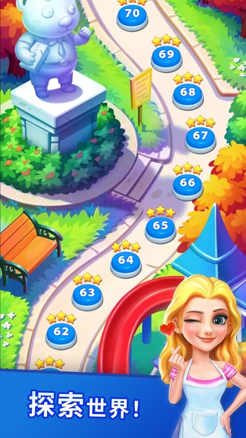 妙趣糖果消在这里玩家经营着自己的一家糖果店铺为了能够向顾客们提供需要的糖果,你要通过消除的操作来提供货物,这里的角色是一个美丽的女孩,她就是老板你只要完成了消除任务之后,她就会获得糖果商品然后为客人们包装好并获得收益。这里会有不同的城市公园道路,作为关卡路线,因为女孩的店是要开向全世界的,所以一路上会有不同的场景变化。
