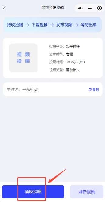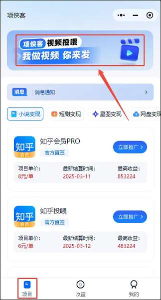 1、打开项侠客小程序,在项目界面,点击上面视频投喂板块。