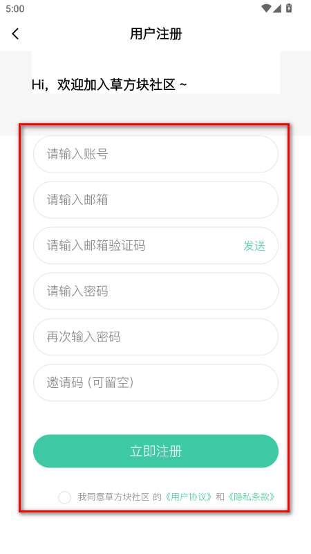 4、请按照要求输入以下信息,勾选我同意草方块社区 的《用户协议》和《隐私条款》,然后点击立即注册即可。