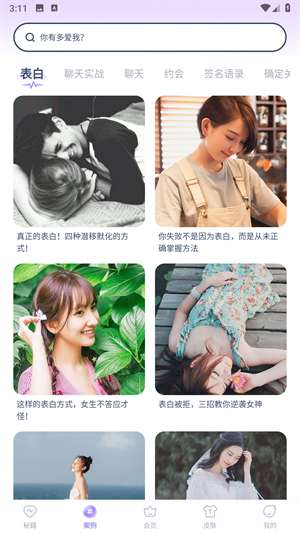 2、恋爱攻略阅读:我们提供大量的恋爱攻略文章,帮助用户快速掌握聊天技巧,提高恋爱沟通能力。