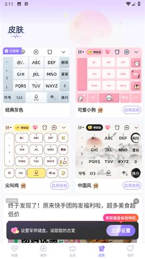3、进入皮肤一栏,可以设置你的键盘皮肤。