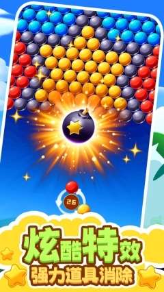 4、策略和技能测试:玩家需要使用策略来准确计算发射角度和力,连接三个或更多相同颜色的泡泡来消除。