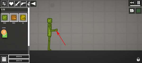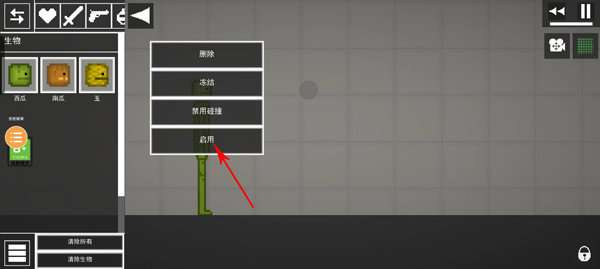 然后将胳膊抬起,双击西瓜角色胳膊会出现删除、冻结、静置碰撞、启用,选择冻结,胳膊就会停住;
