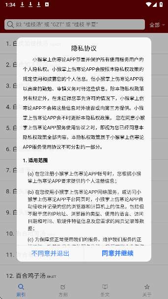 1、同意用户协议,进入小猴掌上伤寒论app。