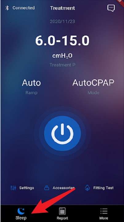 3、点击下方睡眠按钮,进入控制界面,手动开启或关闭呼吸机的治疗功能。