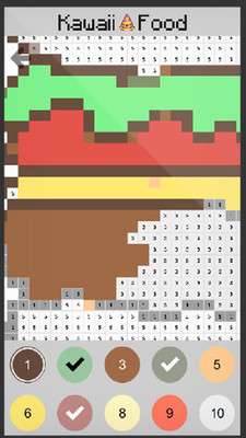 食品像素艺术一个卡通版美食的填色游戏,在这里会有很多新的填色图纸可以选择,在选择的时候会有预览图可以看到很具自己的喜好可以挑选,之后就可以直接进入到颜色的填充中去。刚开始需要学会如何完成操作,根据上面显示的数字开始完成一些颜色的填充。在这里可以自己选择顺序完成填充的操作,没有时间的限制可以很自由的开始点击颜色像素方块。
